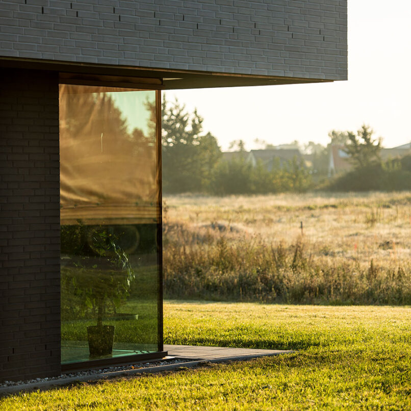 Ein sandgrauer Klinker prägt die äußere Gestalt und trägt mit dem zurückspringenden, anthraziten Mauerwerk zum zeitlosen Erscheinungsbild des Gebäudes bei.