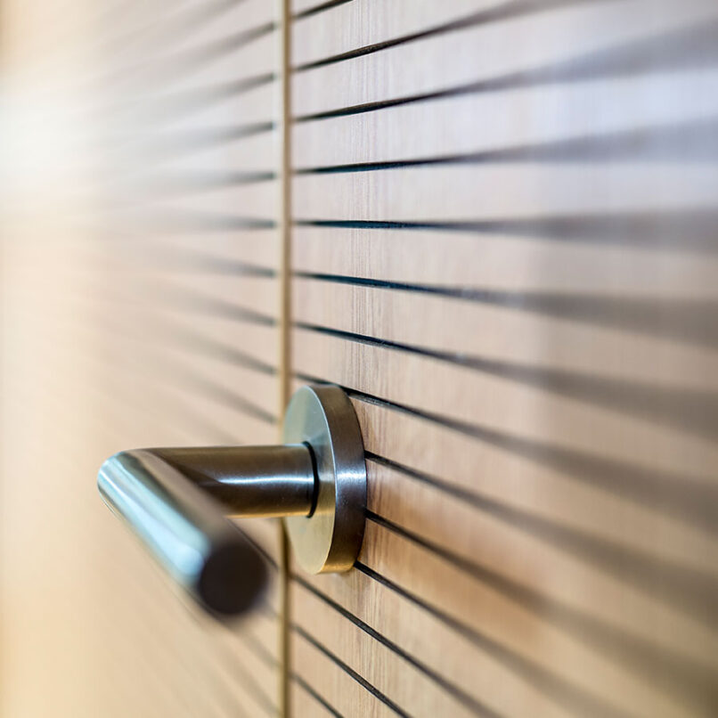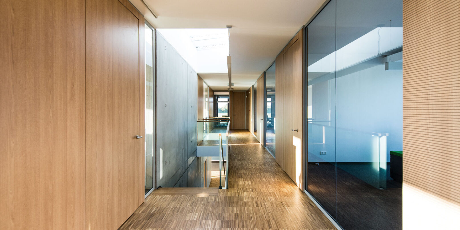 Raumhohe Glastrennwände wechseln rhythmisch mit massiven, raumhohen Türelementen und trennen die Büros als Rückzugsbereiche für konzentriertes Arbeiten zu den Fluren.