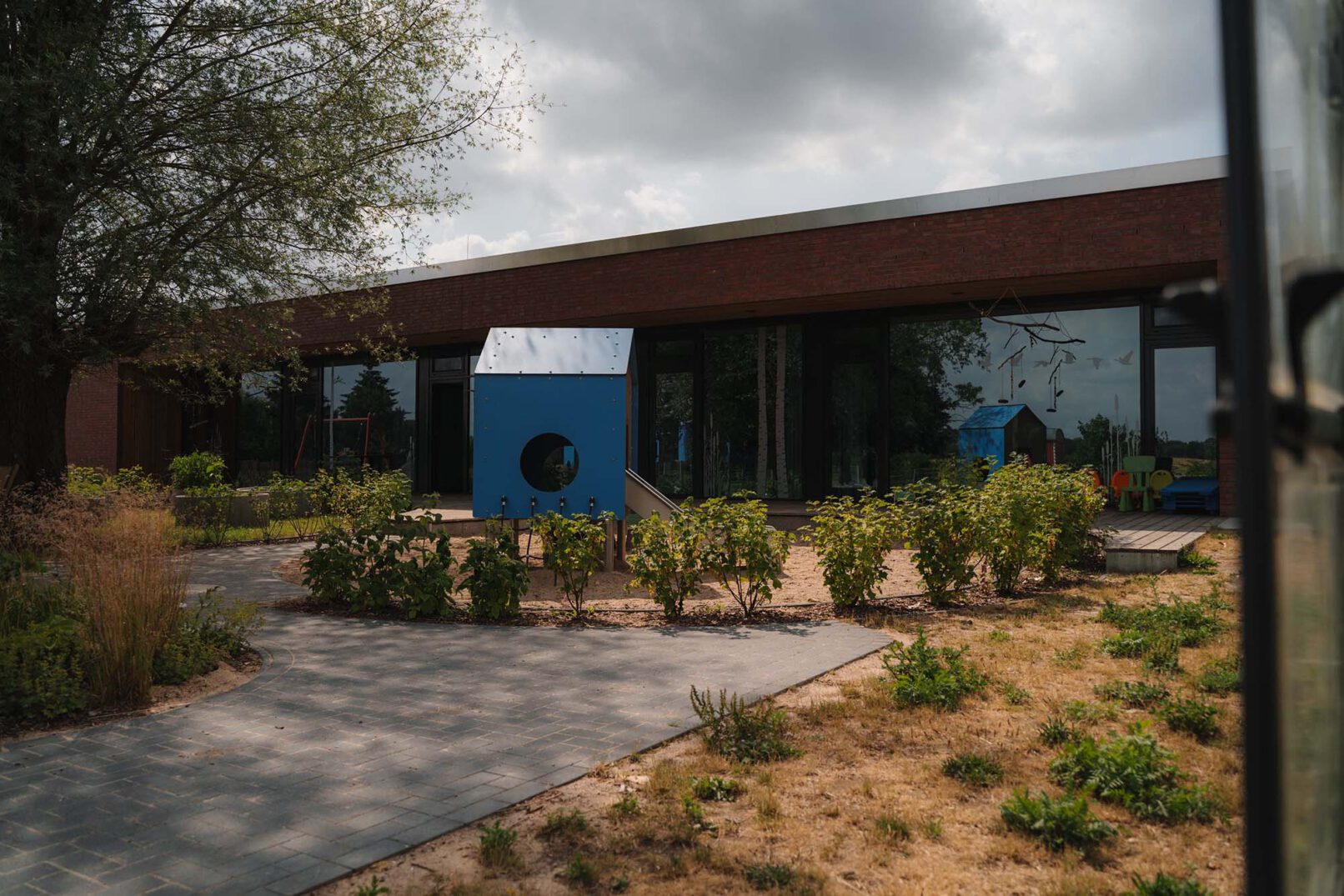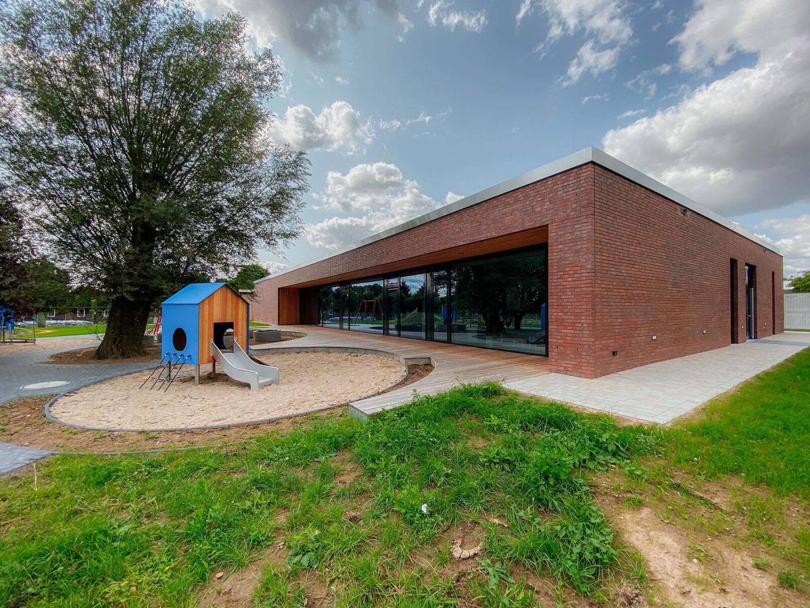 Als neues Gebäude möchte die Kindertagesstätte erkannt werden, will sich aber auch in seine Umgebung integrieren. Das Flachdach nimmt der Bauform Massivität und Höhe. Einschnitte in der Fassade ermöglicht spannende Außenbereiche und Blickbeziehungen für die verschiedenen Bedürfnisse der Nutzer. Die Fassade aus Ziegelmauerwerk mit den großen Öffnungen nimmt eine klare, aber offene Haltung zur Umgebung ein. Einen Kontrast zum Ziegel bietet die Wahl einer Lärchenholzverkleidung an Wand und Deckenflächen der Fassadeneinschnitte.