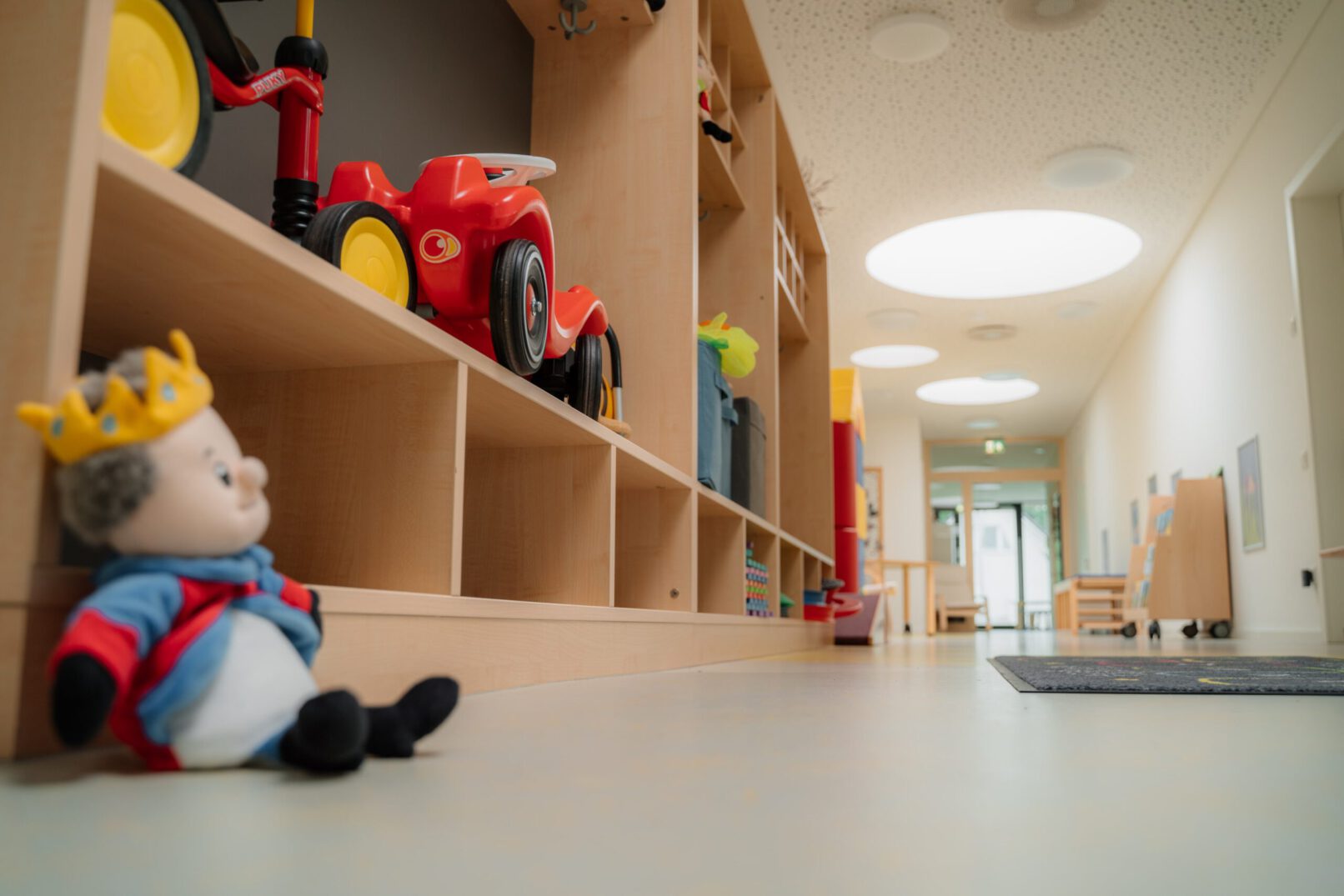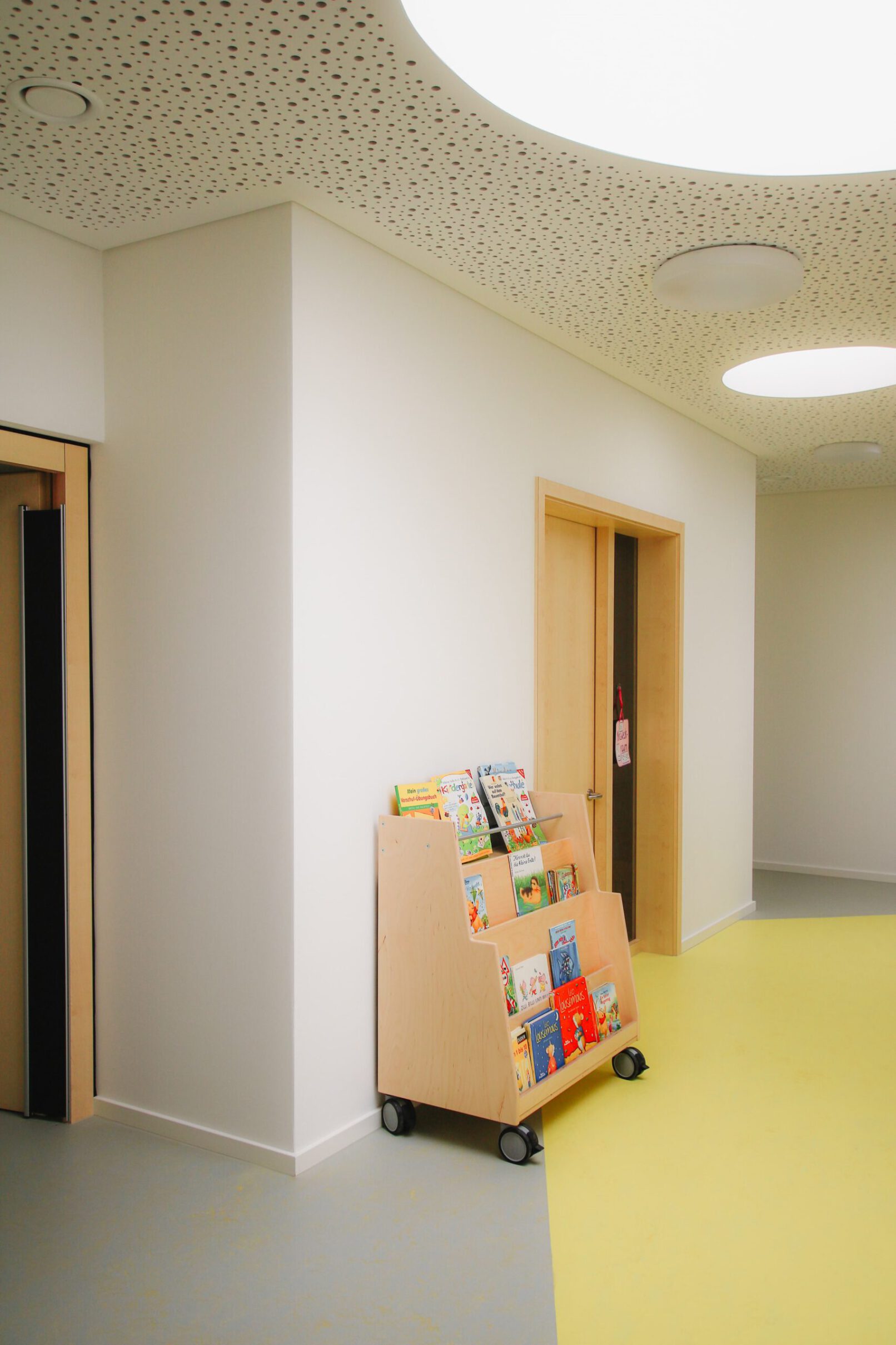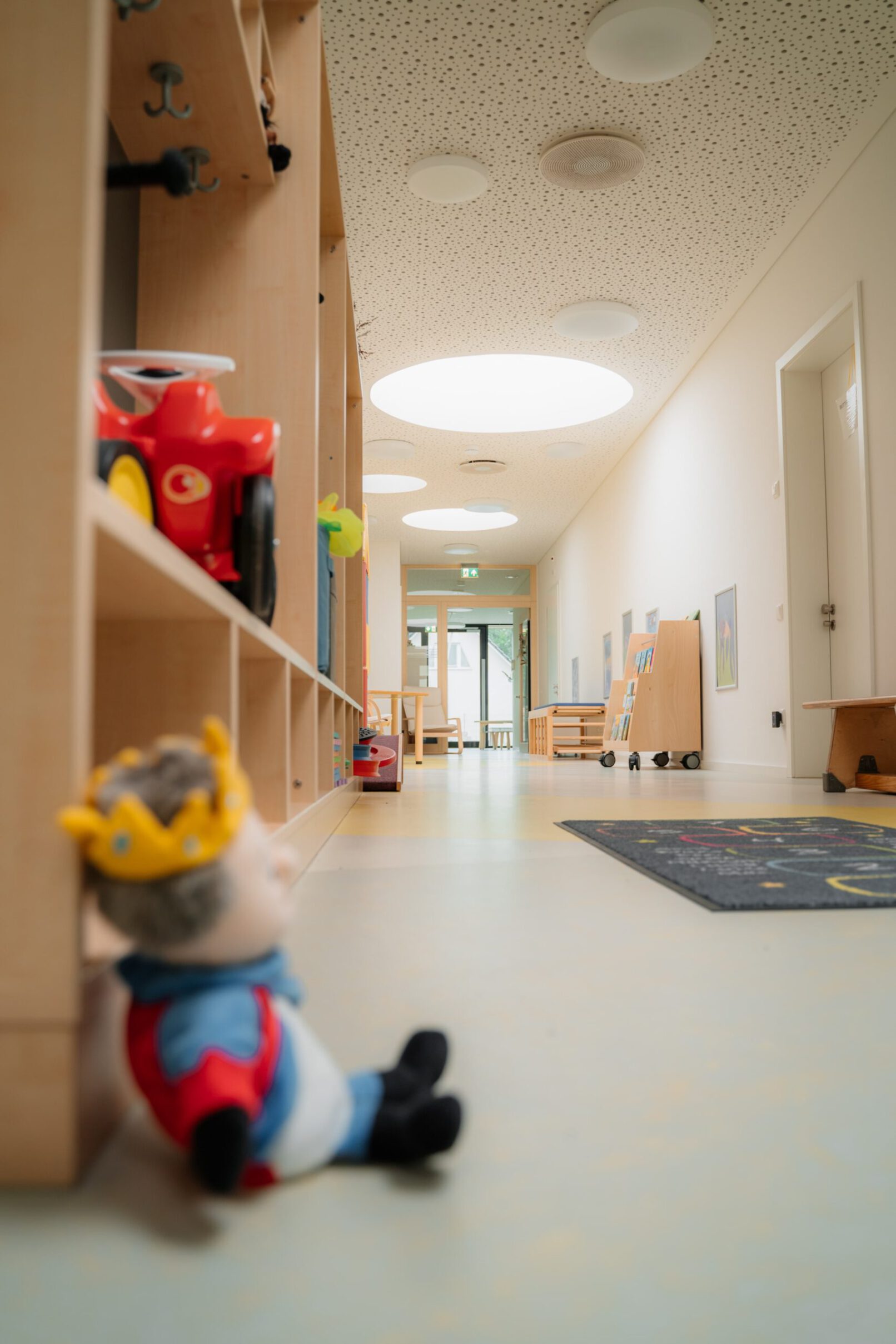 Die Gruppenräume sind in Größe und Anordnung so gestaltet, dass es Durchmischungen zwischen Krippen- und Kindergartenbereich geben kann. Ebenso ermöglicht dies der Gemeinde auf den entsprechenden Mehr- oder Minderbedarf an Kitaplätzen zu reagieren. Jeweils 2 Gruppen teilen sich einen innenliegenden Sanitärraum, der mittels Oberlichtern belichtet wird. Die Kita-Leitung erhält ein Büro im Eingangsbereich der Kita. Ein Kinderrestaurant mit Kinderküche ergänzt das Erdgeschoss als separaten Ort zur Verpflegung der Kinder. Dieser Raum wird ebenso als Speise- und Kreativraum genutzt.