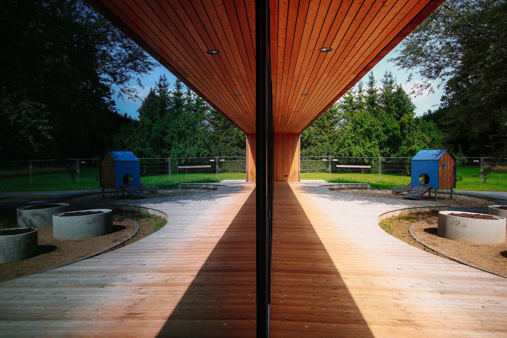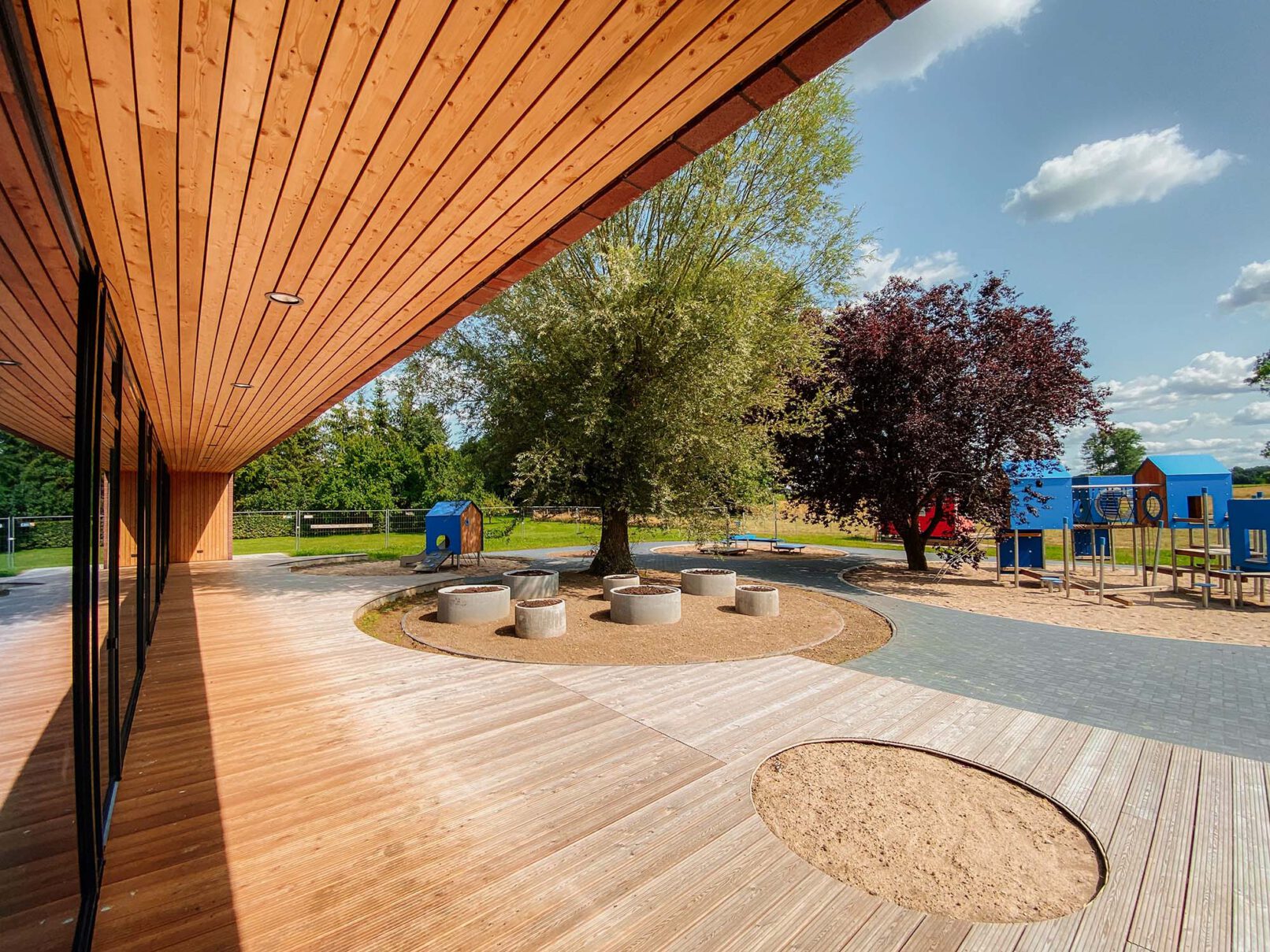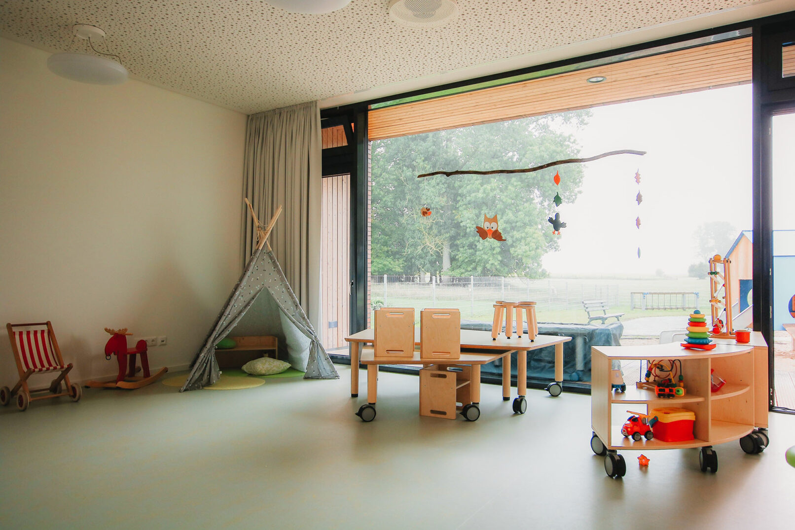 Die großen Öffnungen werden in einer Pfosten-Riegel-Konstruktion als zurückgesetzte Glasfassade ausgeführt. Dahinter verbergen sich die Gruppenräume mit Spiel- und Bewegungsflächen, die den Bezug nach außen zulassen, sodass die Umgebung mit Licht und Natur – auch jahreszeitlich bedingt – im Alltag allgegenwärtig ist. Ebenerdig grenzen Terrassenflächen an die Glasfassaden, die den direkten Zugang zum Außenraum und deren Spiel- und Bewegungsflächen ermöglichen.